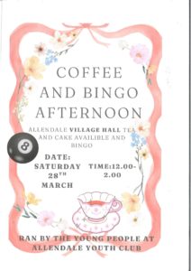 Coffee and Bingo Afternoon run by Allendale Youth Club event from 12 to 2 Calendar When: 28th March 2026 @ 11:00 am – 3:00 pm 2026-03-28T11:00:00+00:00 2026-03-28T15:00:00+00:00 Where: small hall and kitchen Contact: Charlotte Robinson Reid Community Event Young People